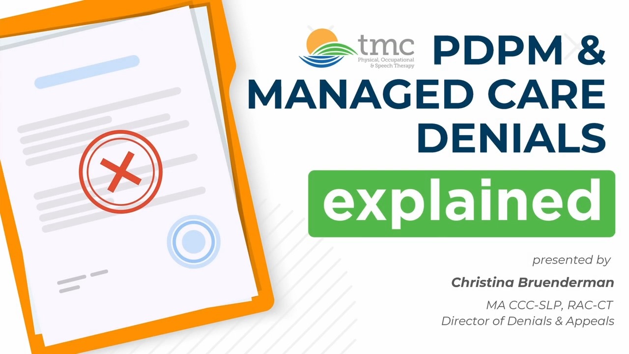 Last week Christina Bruenderman, TMC’s Director of Denials and Appeals, shared the top reasons for PDPM and Managed Care denials and how to prevent them.